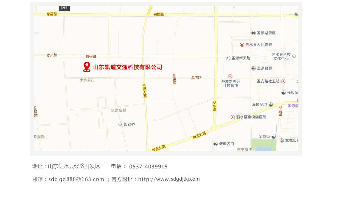 山东城际轨道交通科技有限公司 地址:山东省泗水县经济开发区 电话:0537-4031767 传真:0537-4039919 邮箱:sdcjgd888@163.com 官方网址:http://www.sdgdjtkj.com