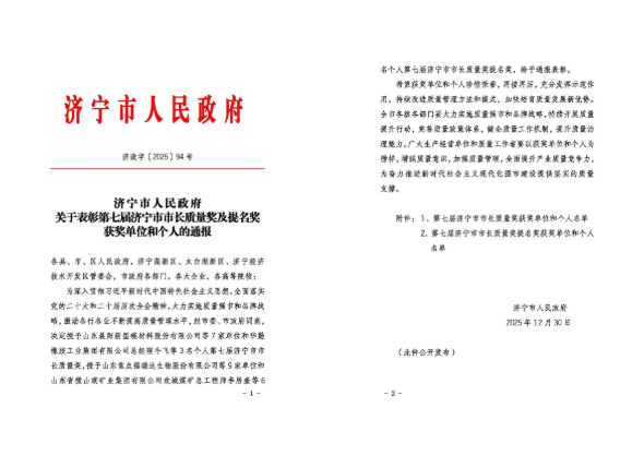 日前,第七届济宁市市长质量奖的获奖名单正式发布,山东城际轨道交通科技股份有限公司,荣获市长质量奖提名奖。 济宁市市长质量奖由济宁市人民政府设立,是全市最高质量荣誉,是深入实施质量强市和品牌战略的重要举措。该奖项每两年评选一届,目的是引导和激励各行各业全面提升产品质量、工程质量和服务质量,表彰在质量管理与实践创新中取得突出成效的单位和个人,进一步扩大示范引领效应。 这份荣誉,是山东城际轨道交通科技股份有限公司在质量管控、技术创新、服务升级等领域持续深耕的有力见证。未来,企业将以此为新起点,锚定高质量发展目标,不断夯实质量基础、深化创新实践,以更严苛的标准、更优质的产品、更专业的服务,践行企业责任与担当。同时,也将积极发挥示范带动作用,与行业同仁携手共进,共同推动区域产业质量水平迈上新台阶。
